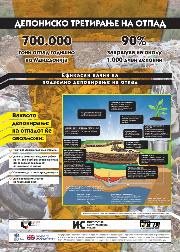 „Депонирањето на отпадот, пак, треба да биде подземно, во претходно оформени базени, за да се заштитат почвата, водите и атмосферата. На најголемата депонија во државата, Дрисла треба да се затворат сегашните и да се отворат нови депониски места, да може да се формира депониски гас и да се замени печката за согорување на медицинскиот отпад“, смета студентот Тодоровски.