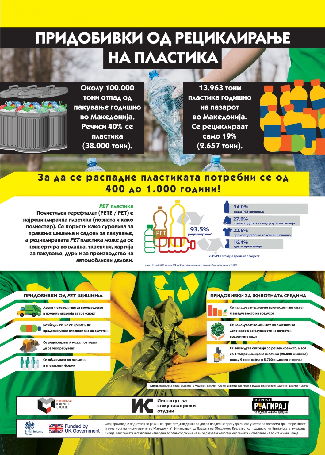 „Од 13.963 тони пластика годишно на пазарот во Македонија, се рециклираат само 19% (2.657 тони). Со 1 тон рециклирана пластика (20.000 шишиња) се заштедуваат околу 2 тони нафта и 5.700 киловати енергија, што е еднакво на потрошена енергија од две лица за време од една година и количина на вода што би ја користело едно лице за време од два месеци“, објасни студентката на Машинскиот факултет Јована Лозановска.