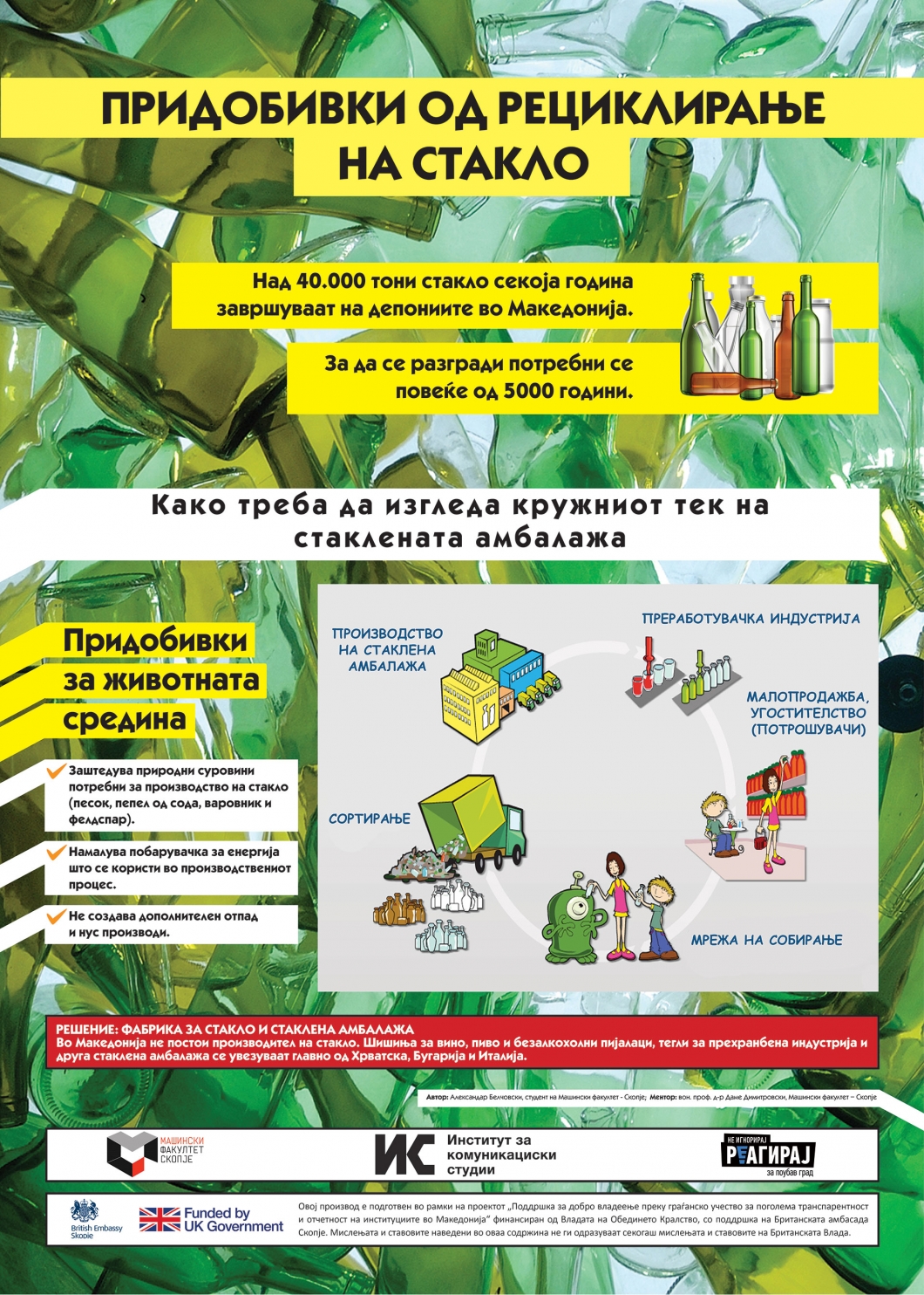 „Во Македонија не постои производител на стакло. Шишиња за вино, пиво и безалкохолни пијалаци, тегли за прехранбена индустрија и друга стаклена амбалажа се увезуваат главно од Хрватска, Бугарија и Италија“, вели студентот на Машинскиот факултет Александар Белчовски.