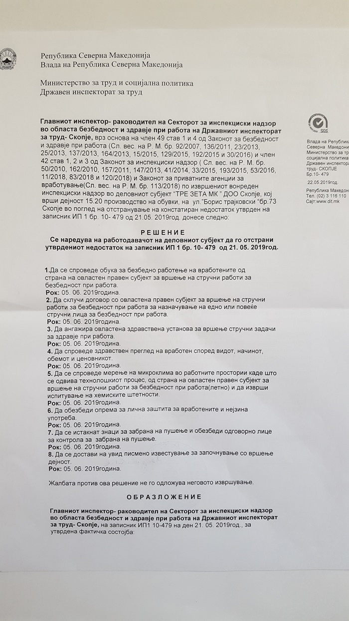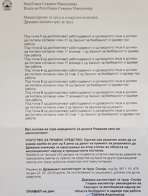 Констатирани се неколку пропусти, за кои издадов решение за нивно отстранување. Меѓу нив, издадов решение и за спроведување на мерење микроклима во работните простории каде што се одвива технолошкиот процес, од страна на овластен правен субјект за вршење стручни работи за безбедност при работа и да изврши испитување на хемиски штетности“, вели инспекторката Андоновска.