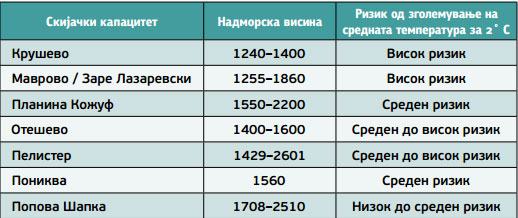 Предвидувањата се дека ако просечната температура се зголеми за 2 степени до 2030 година скијачките центри Маврово и Крушево, кои се на помала височина, подобро да се преориентираат кон планинарење и велосипедизам.